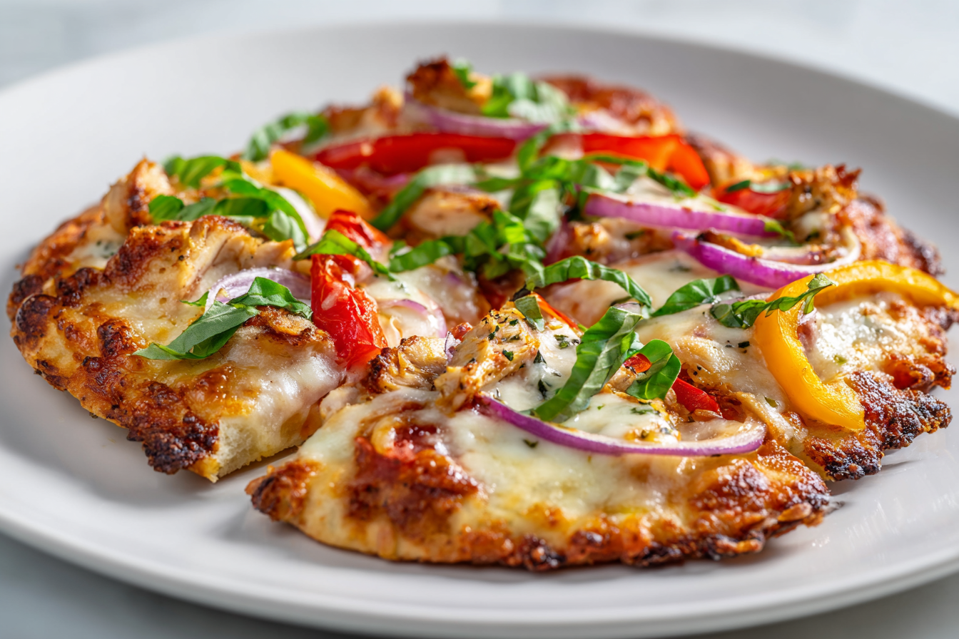 - While the naan is pre-baking, prepare your toppings by thinly slicing the bell peppers and red onion. Chop the rotisserie chicken into small, bite-sized pieces. Slice the fresh mozzarella into thin rounds for even melting.